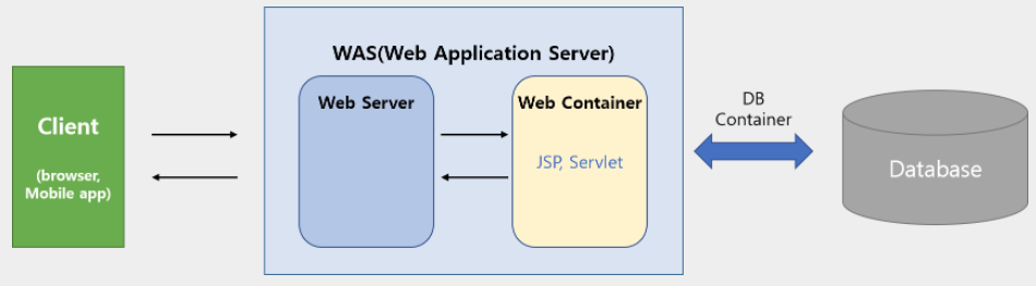 WAS = Web Server + Web Container (JSP, Servlet)- ex : Tomcat