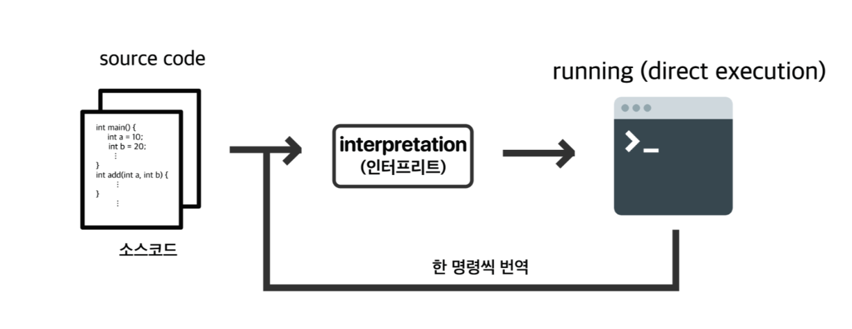 컴파일을 진행하지 않고 인터프리터로 소스코드를 한 줄씩 읽어가며 ‘번역’하고 바로 ‘실행’. (번역 & 실행 동시. 컴파일 언어와 달리 ‘직접’ 기계어로 변환하는 과정이 없다.)